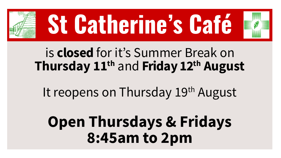 Café closed for Summer Break on Thursday 11th & Friday 12th August 2016 Posted byStuart PooreAugust 9, 2016June 5, 2025Posted inCafe St Catherine’s Café will be closed on Thursday 11th and Friday 12th August for it’s Summer Break while the Seaside Rock holiday club takes place. It will reopen on Thursday 19th August. Share this: Click to share on Facebook (Opens in new window) Facebook Click to share on WhatsApp (Opens in new window) WhatsApp Click to share on Nextdoor (Opens in new window) Nextdoor Click to email a link to a friend (Opens in new window) Email Related