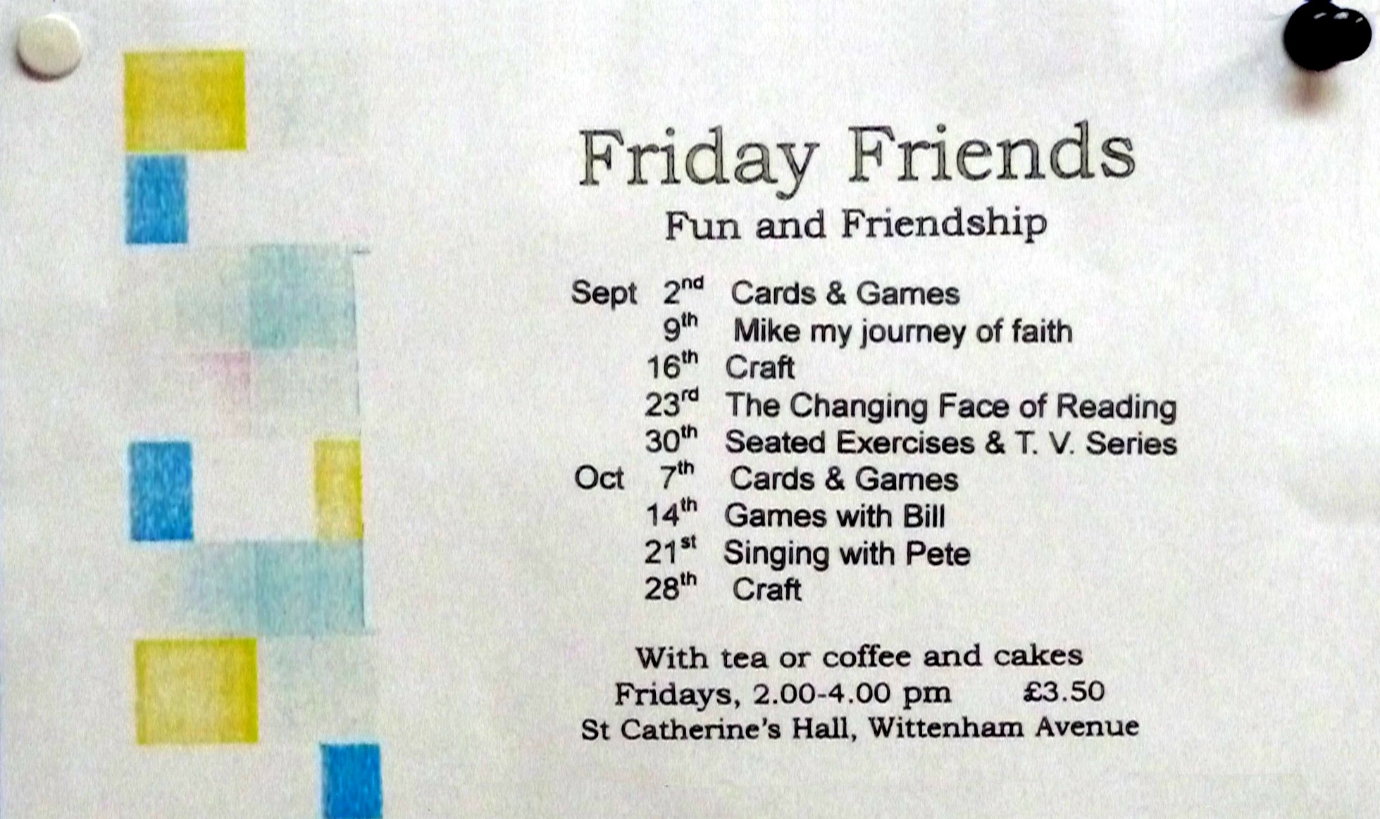 Friday Friends meets weekly from 2.00 – 4.00pm every Friday, price £3.50, offering a mix of light exercise, singing together, tabletop games and craft activities in a safe, warm and friendly environment – with tea and cakes.
