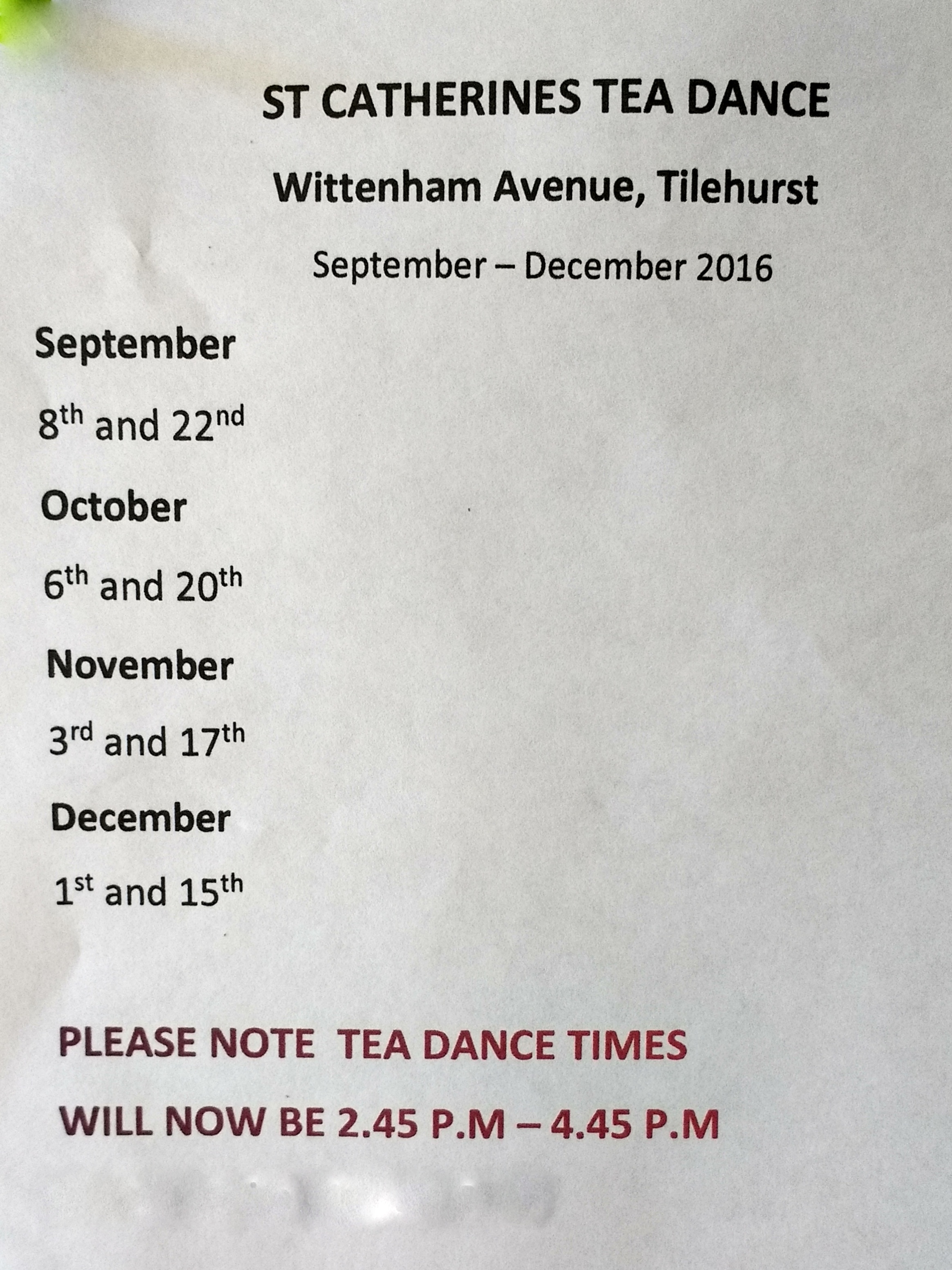 Tea Dance Dates Posted byStuart PooreSeptember 6, 2016September 5, 2016Posted inCentre The next Tea Dance is Thursday 8th September, with subsequent dates of 22nd Sept 6th & 20th October 3rd & 17th November 1st & 15th December Please note the times are now 2:45pm to 4:45 pm. Share this: Click to share on Facebook (Opens in new window) Facebook Click to share on WhatsApp (Opens in new window) WhatsApp Click to share on Nextdoor (Opens in new window) Nextdoor Click to email a link to a friend (Opens in new window) Email Related