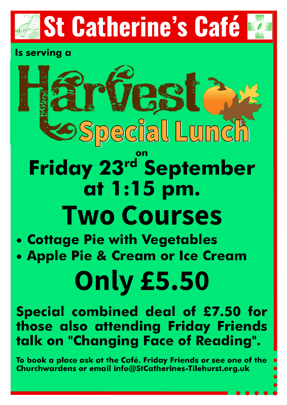 St Catherine’s Café is serving a Harvest Special Lunch on Friday 23rd September at 1:15pm.