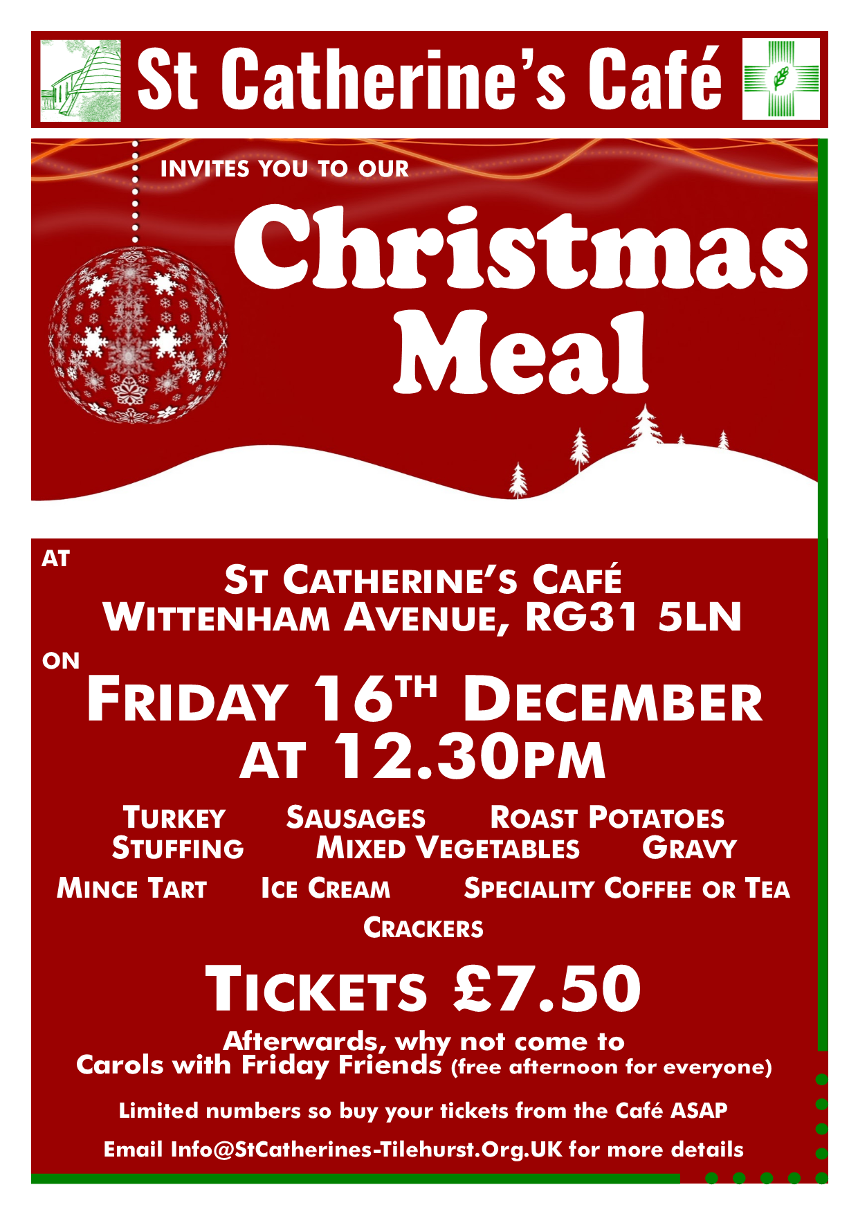 This years Christmas Meal is on Friday 16th December in St Catherine’s Café, starting at 12:30pm. The menu is Turkey, Sausages, Roast Potatoes, Stuffing, Mixed Vegetables and Gravy. Desert is Mince Tart, Ice Cream. They’ll also be Coffee, Tea & Crackers.