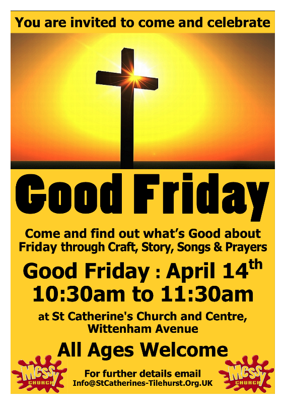 Good Friday – All Age Service Posted byStuart PooreApril 13, 2017April 10, 2017Posted inCentre, Church, Messy Church Everyone is invited to our ‘Messy Church’ style Good Friday service at 10:30am. Share this: Click to share on Facebook (Opens in new window) Facebook Click to share on WhatsApp (Opens in new window) WhatsApp Click to share on Nextdoor (Opens in new window) Nextdoor Click to email a link to a friend (Opens in new window) Email Related