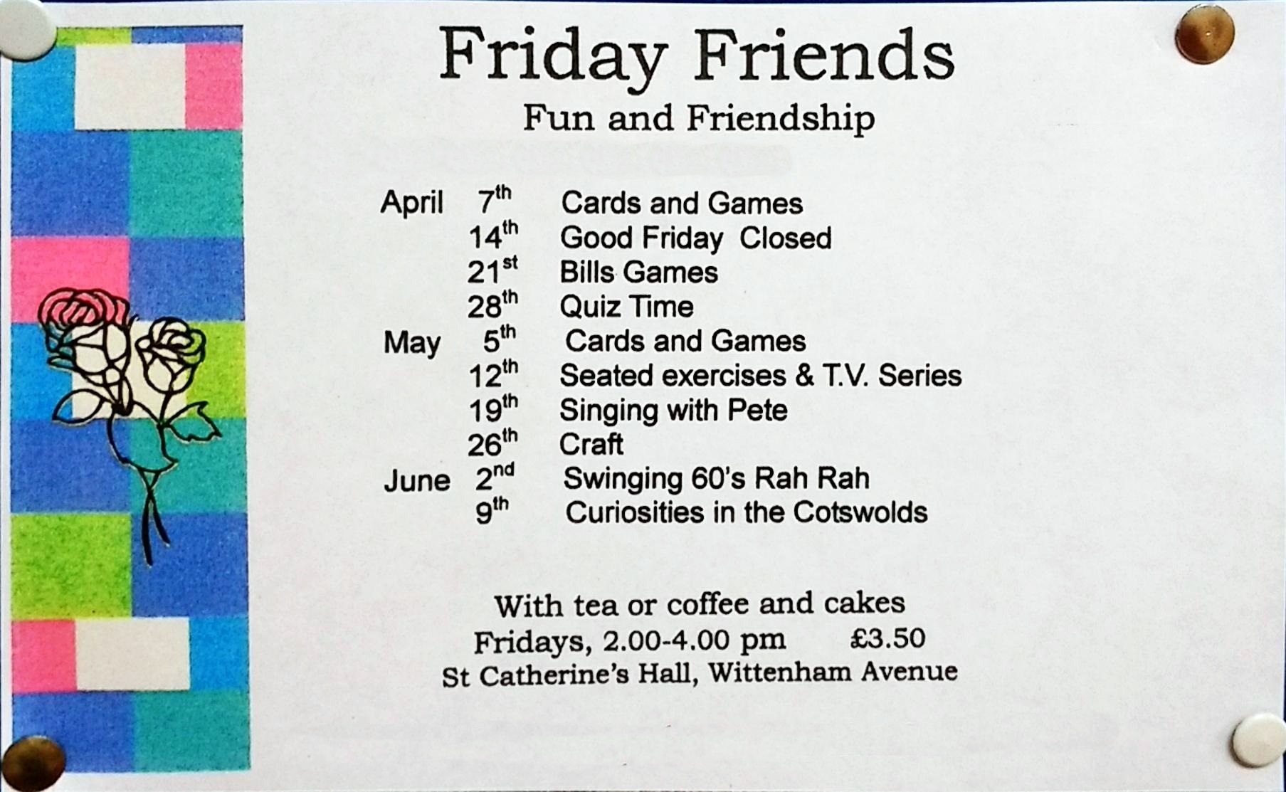 Friday Friends meets weekly from 2.00 – 4.00pm every Friday, price £3.50, offering a mix of light exercise, singing together, tabletop games and craft activities in a safe, warm and friendly environment – with tea and cakes.