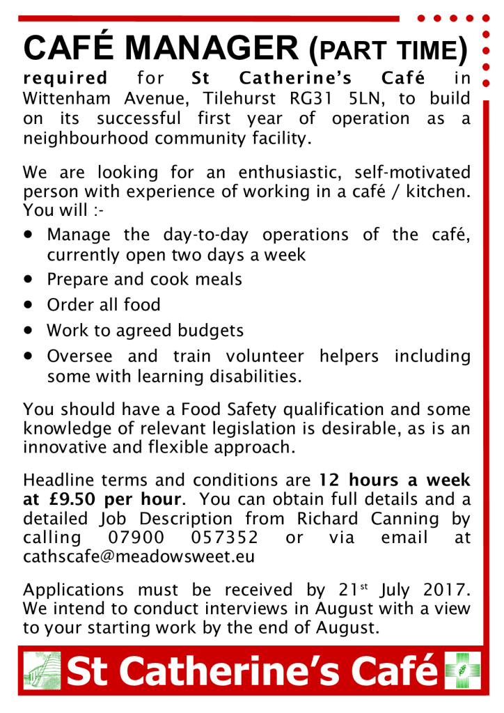 Headline terms and conditions are 12 hours a week at £9.50 per hour. You can obtain full details and a detailed Job Description from Richard Canning by calling 07900 057352 or via email at cathscafe@meadowsweet.eu