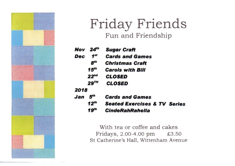Friday Friends meets weekly from 2.00 – 4.00pm every Friday, price £3.50 (carers free), offering a mix of light exercise, singing together, tabletop games and craft activities in a safe, warm and friendly environment – with tea and cakes.