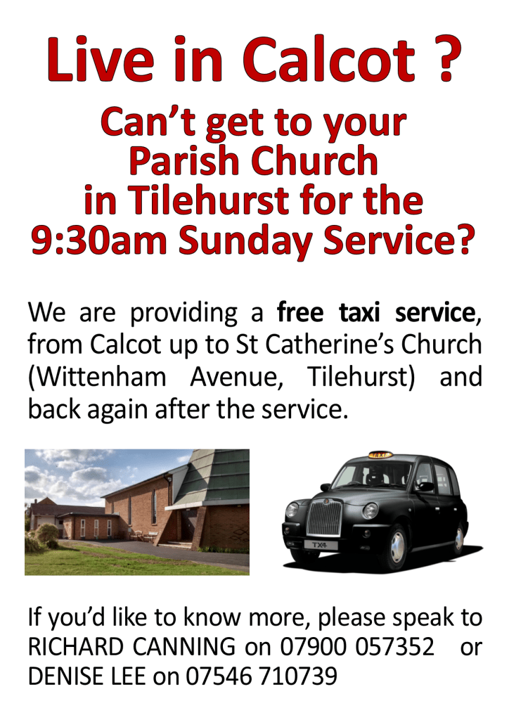 If you live in Calcot, we provide a Taxi service up to the Parish Church of St Catherine’s.