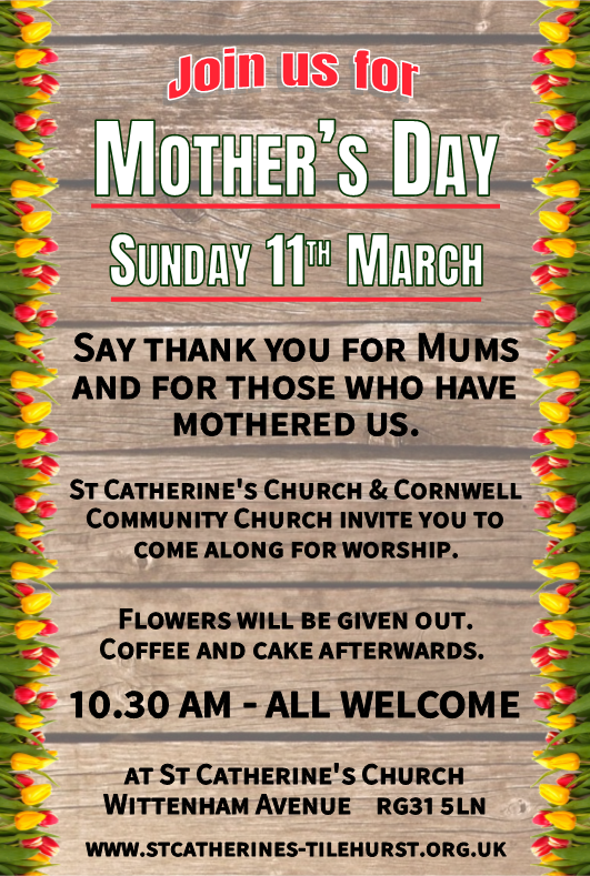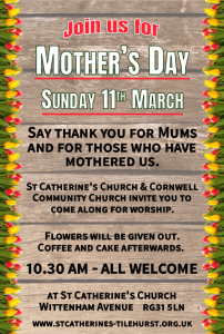 Say thank you for Mums and for those who have mothered us. St Catherine’s Church & Cornwell Community Church invite you to come along for worship.