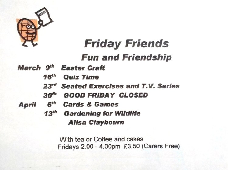 Friday Friends meets weekly from 2.00 – 4.00pm every Friday, price £3.50 (carers free), offering a mix of light exercise, singing together, tabletop games and craft activities in a safe, warm and friendly environment – with tea and cakes.