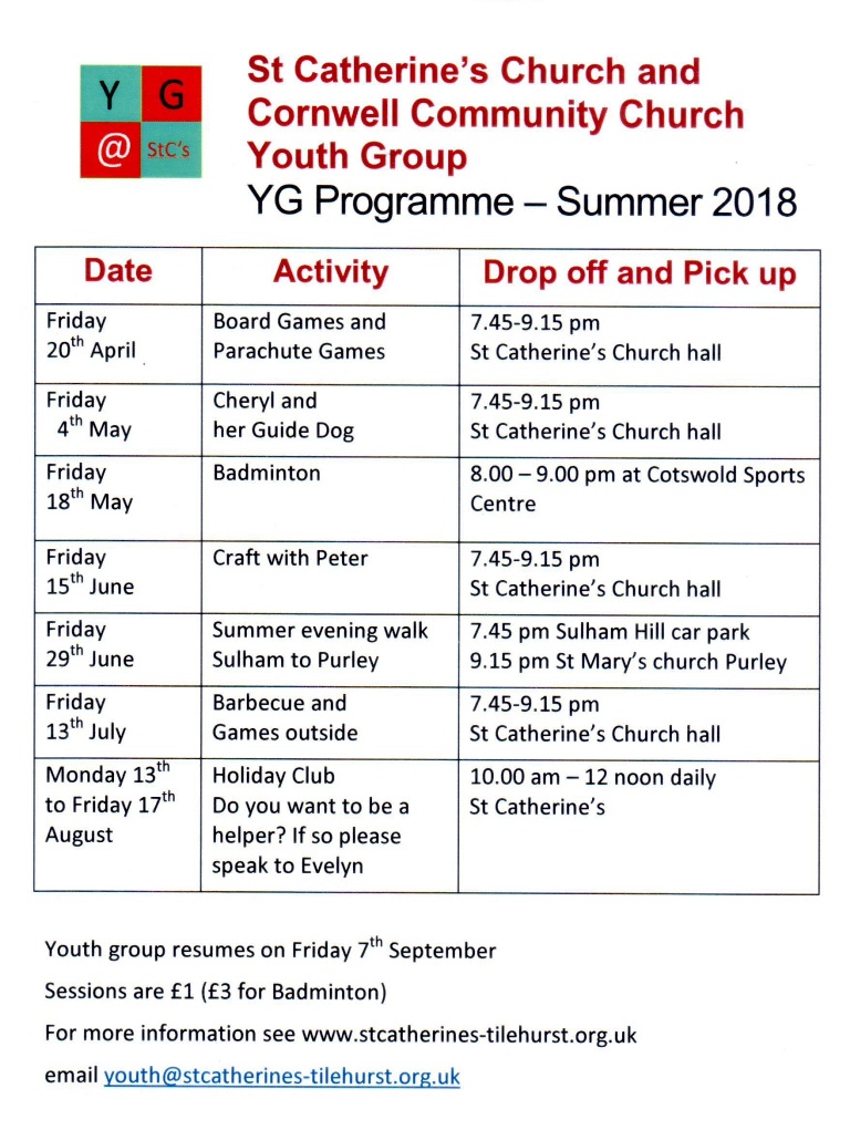 Youth Group Programme – Summer ’18 Posted byStuart PooreApril 14, 2018September 6, 2018Posted inCentre, Children & Youth The Youth Group is for secondary school aged young adults and meets fortnightly in St Catherine’s Hall from 7:45 to 9:15pm. It restarts on April 20th. See the flyer for additional dates and details. Share this: Click to share on Facebook (Opens in new window) Facebook Click to share on WhatsApp (Opens in new window) WhatsApp Click to share on Nextdoor (Opens in new window) Nextdoor Click to email a link to a friend (Opens in new window) Email Related