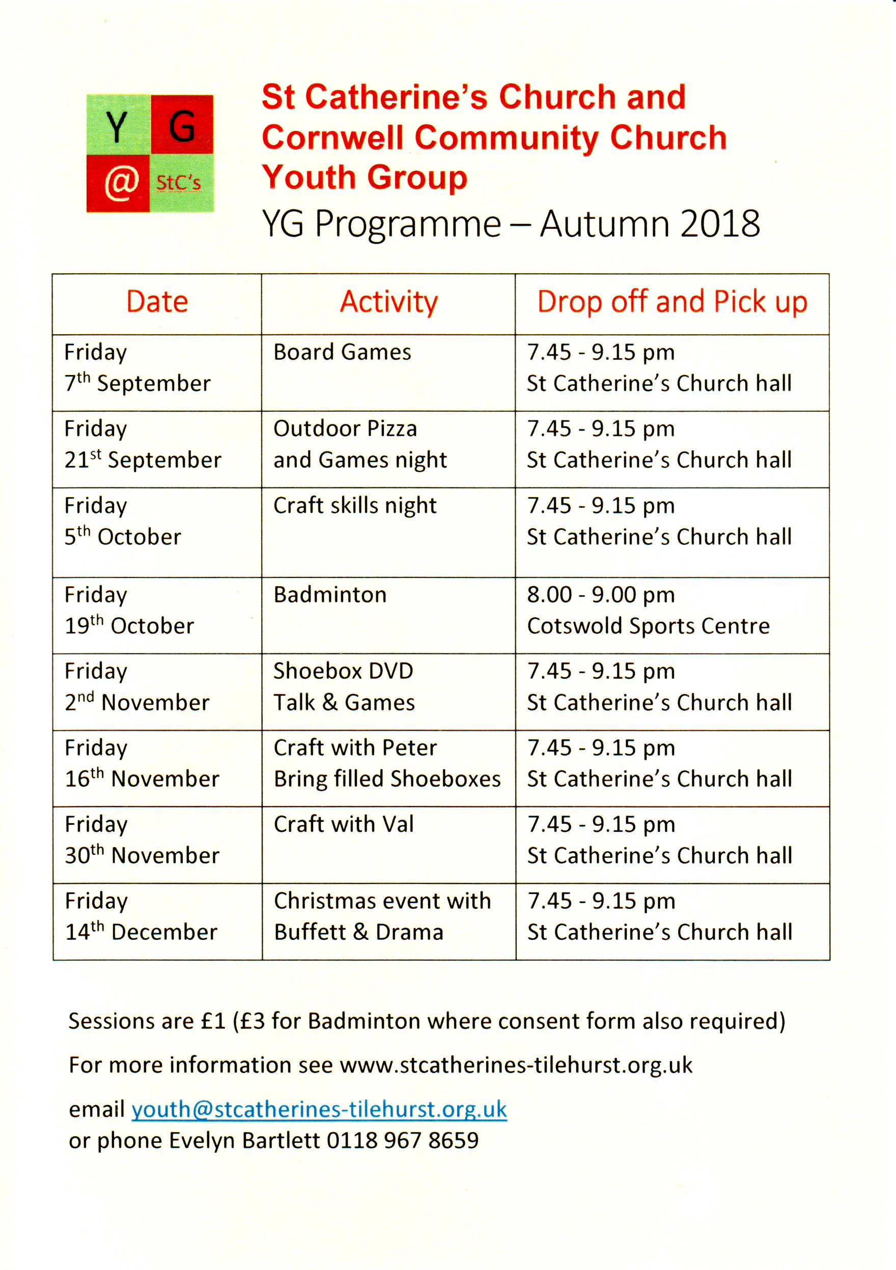 Youth Group Programme – Autumn ’18 Posted byStuart PooreSeptember 6, 2018September 6, 2018Posted inCentre, Children & Youth The Youth Group is for secondary school aged young adults and meets fortnightly in St Catherine’s Hall from 7:45 to 9:15pm. It restarts on September 7th. See the flyer for additional dates and details. Share this: Click to share on Facebook (Opens in new window) Facebook Click to share on WhatsApp (Opens in new window) WhatsApp Click to share on Nextdoor (Opens in new window) Nextdoor Click to email a link to a friend (Opens in new window) Email Related