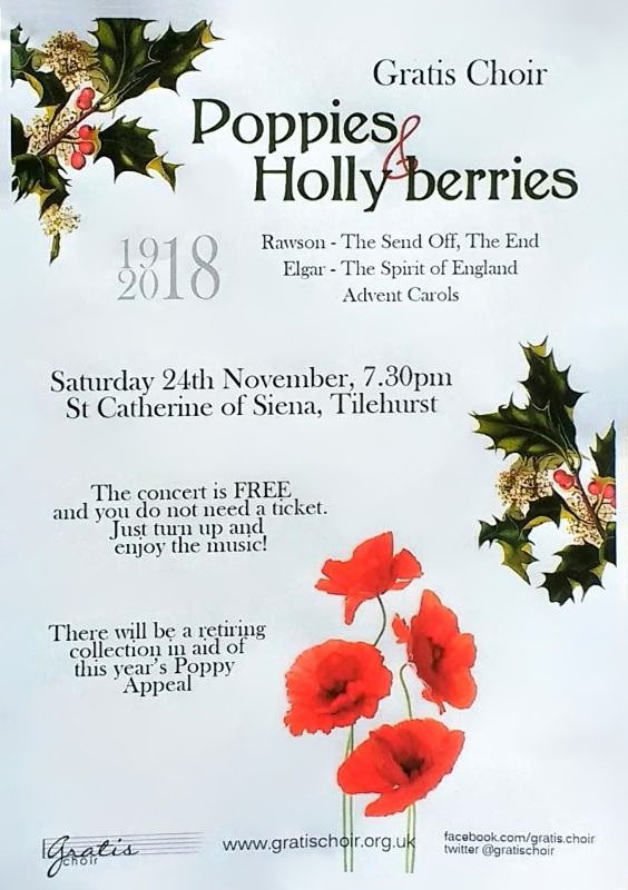 Please join us on Saturday 24th November at 7:30pm as the Gratis Choir perform a selection entitled “Poppies and Holly Berries”.