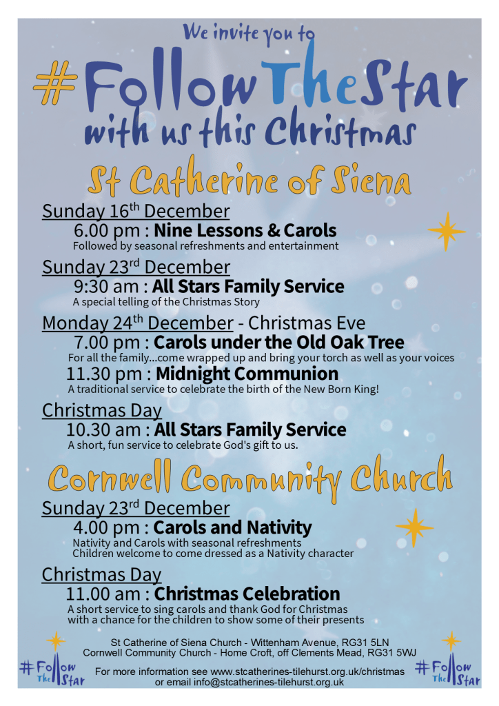 Our Nine Lessons and Carols service is this Sunday 16th at 6pm. It is followed by seasonal refreshments and entertainment in the hall.