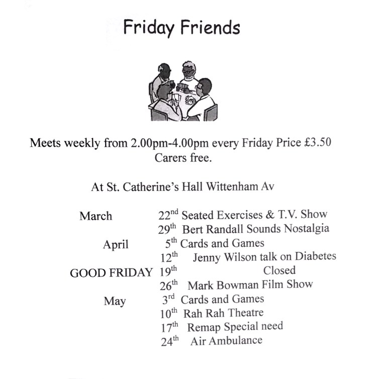 Friday Friends meets weekly from 2.00 – 4.00pm every Friday, price £3.50 (carers free), offering a mix of talks, light exercise, singing together, tabletop games or craft activities in a safe, warm and friendly environment – with tea and cakes.