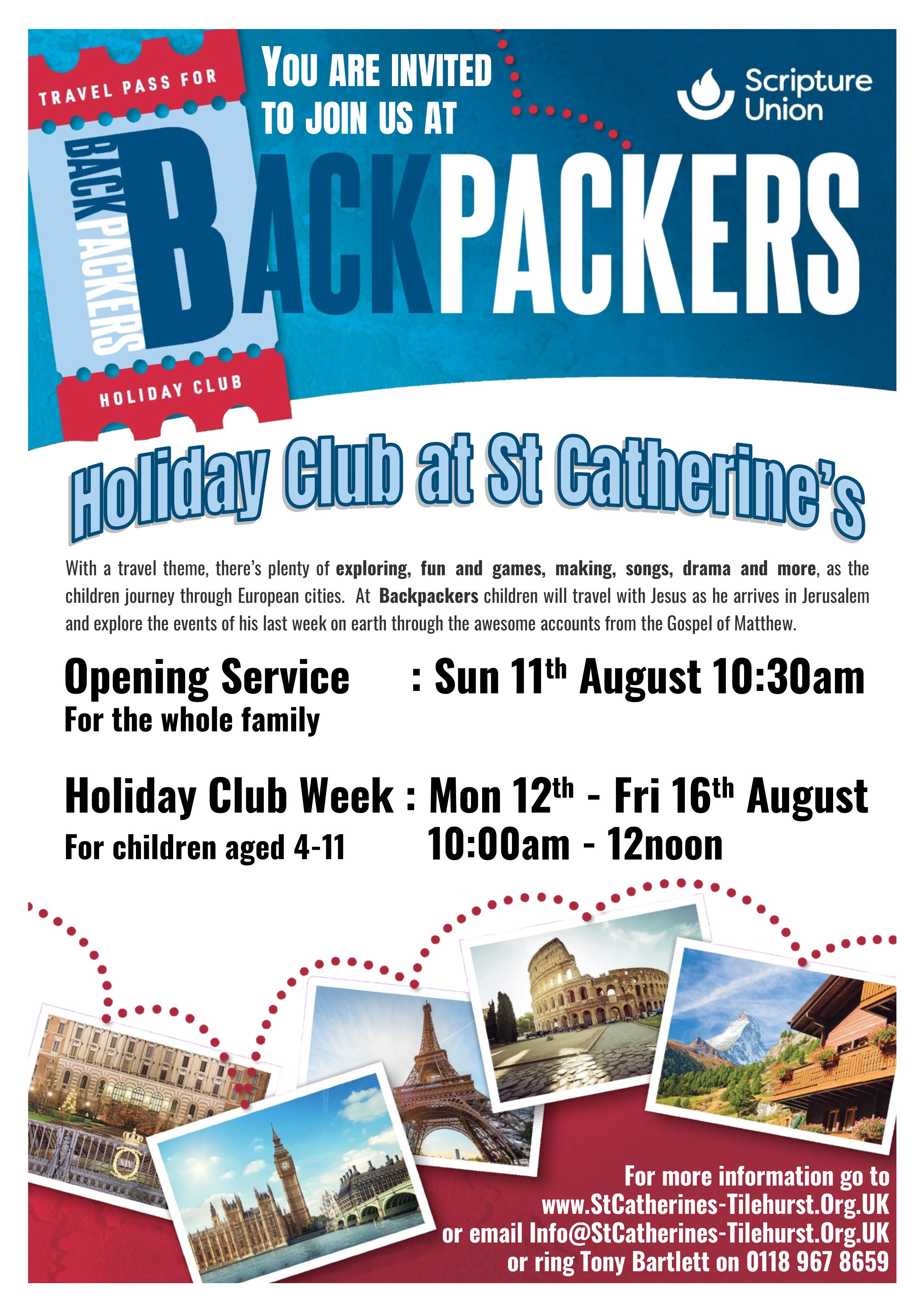 Backpackers will take place from Monday 12th August to Friday 16th, from 10am to 12noon. These is also an opening ‘preview’ service for all the family on Sunday 11th August at 10:30am.