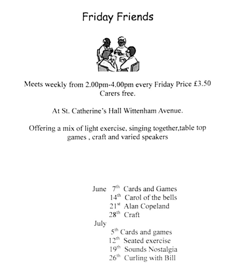 Friday Friends meets weekly from 2.00 – 4.00pm every Friday, price £3.50 (carers free), offering a mix of talks, light exercise, singing together, tabletop games or craft activities in a safe, warm and friendly environment – with tea and cakes.