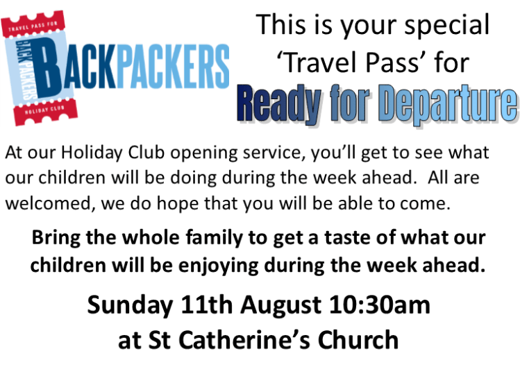 You are invited to a special Backpackers Holiday Club opening service at St Catherine’s on Sunday 11th August, starting at 10:30am.