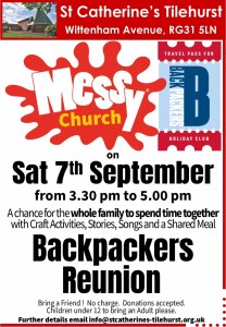 Whether you joined us in August for our ‘Backpackers’ Holiday Club or not, you are all invited to our Holiday Club reunion at Messy Church this coming Saturday 7th September at 3:30pm.