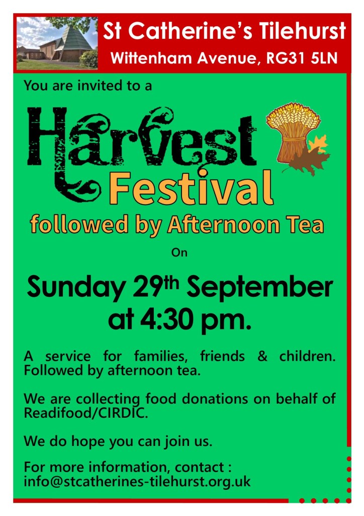Our Harvest Festival is Sunday 29th September at 4.30pm followed by a bring and share afternoon tea.