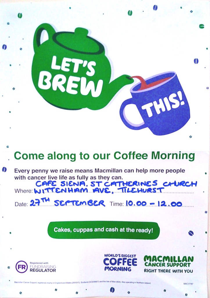 We’re holding a Macmillan Coffee Morning on Friday 27th September from 10am – 12noon.