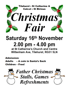 Please join us at St Catherine’s for our Christmas Fair on Saturday 16th November. Doors open at 2:00pm. Admission for children is free, for adults we ask for a donation into Santa’s sack.