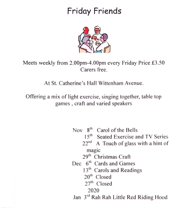 Friday Friends meets weekly from 2.00 – 4.00pm every Friday, price £3.50 (carers free), offering a mix of talks, light exercise, singing together, tabletop games or craft activities in a safe, warm and friendly environment – with tea and cakes.