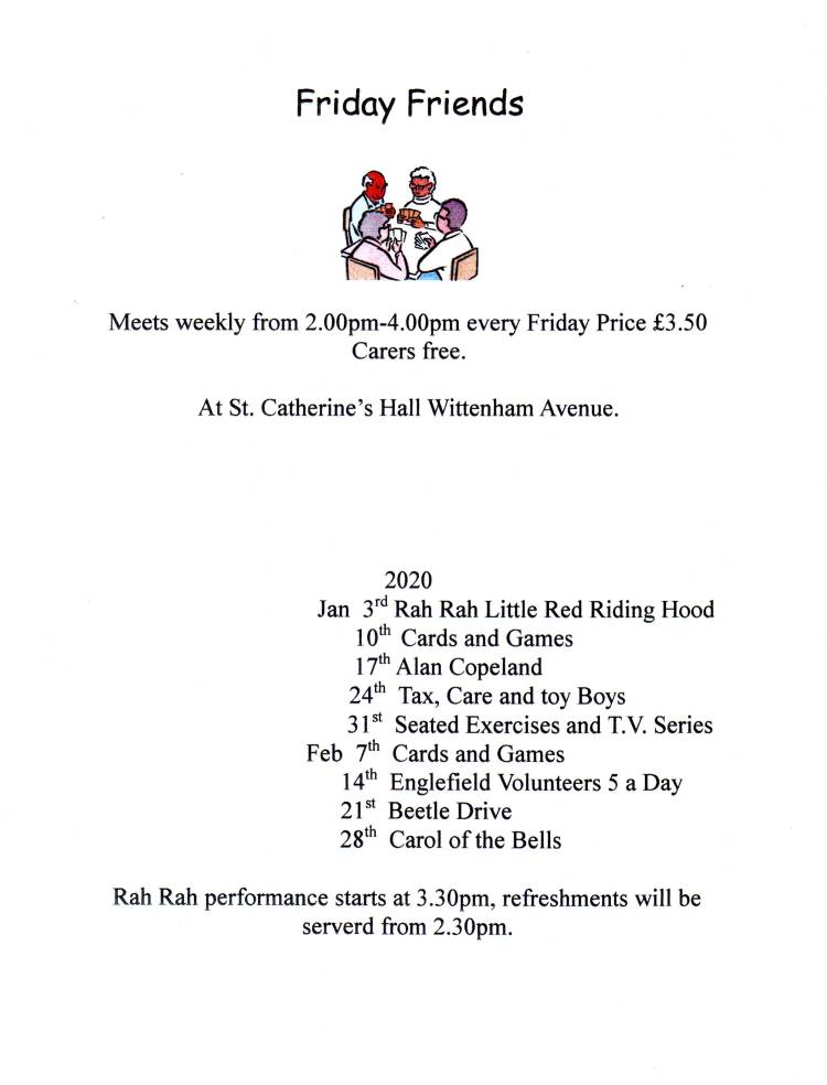 Friday Friends meets weekly from 2.00 – 4.00pm every Friday, price £3.50 (carers free), offering a mix of talks, light exercise, singing together, tabletop games or craft activities in a safe, warm and friendly environment – with tea and cakes.