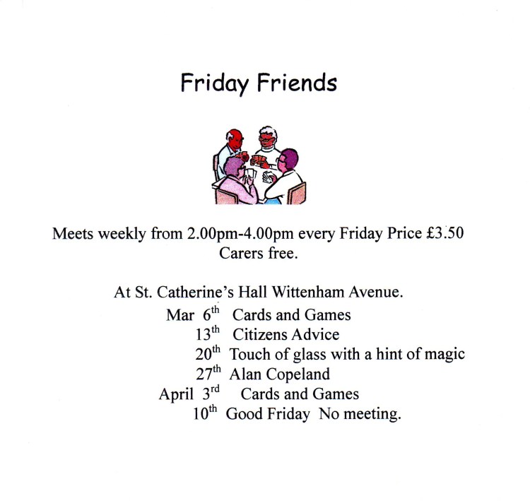 Friday Friends meets weekly from 2.00 – 4.00pm every Friday, price £3.50 (carers free), offering a mix of talks, light exercise, singing together, tabletop games or craft activities in a safe, warm and friendly environment – with tea and cakes.