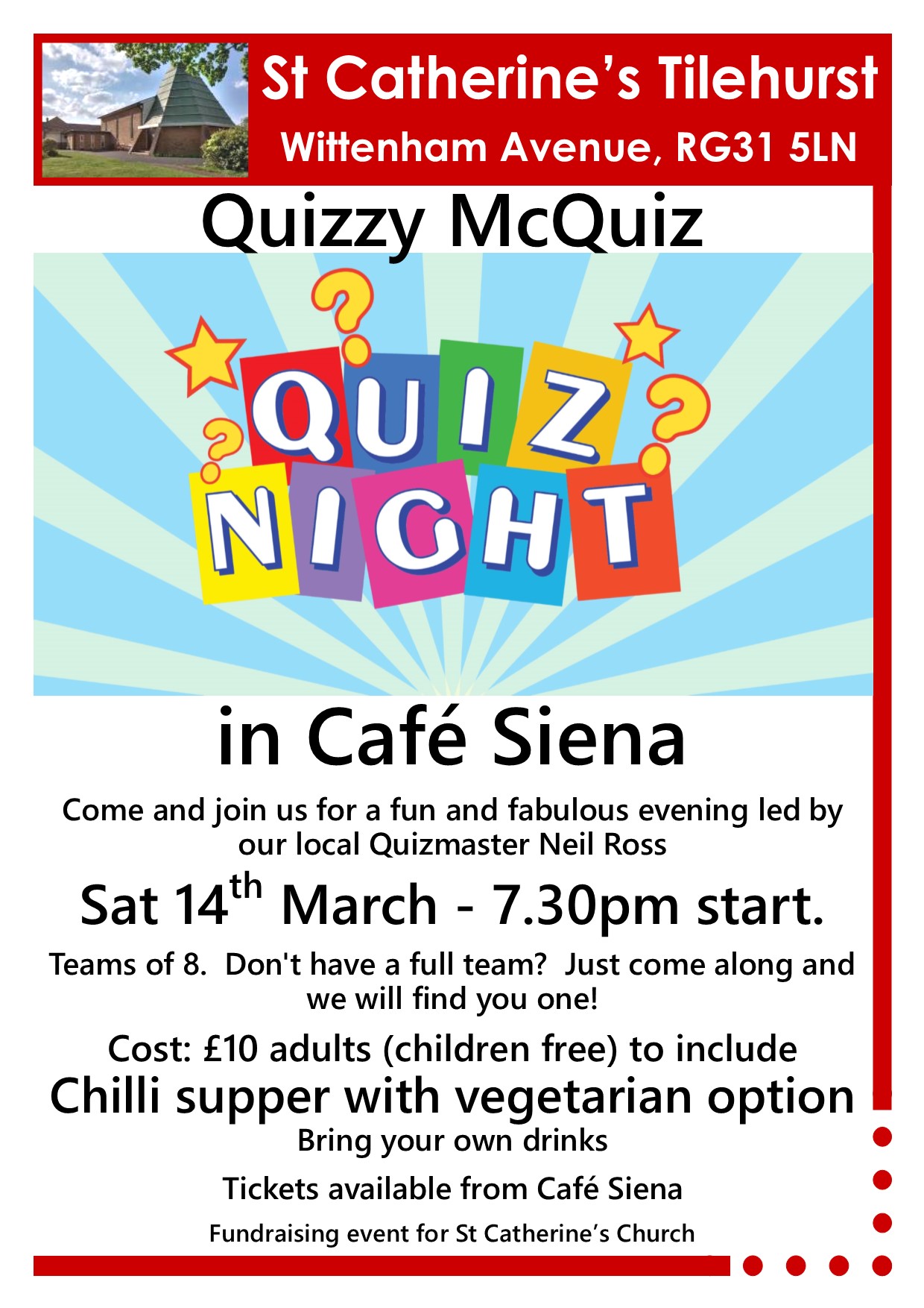 Come and join us in Café Siena for a fun and fabulous “Quizzy McQuiz ” evening led by our local Quizmaster Neil Ross, on Saturday 14th March – 7.30pm start.