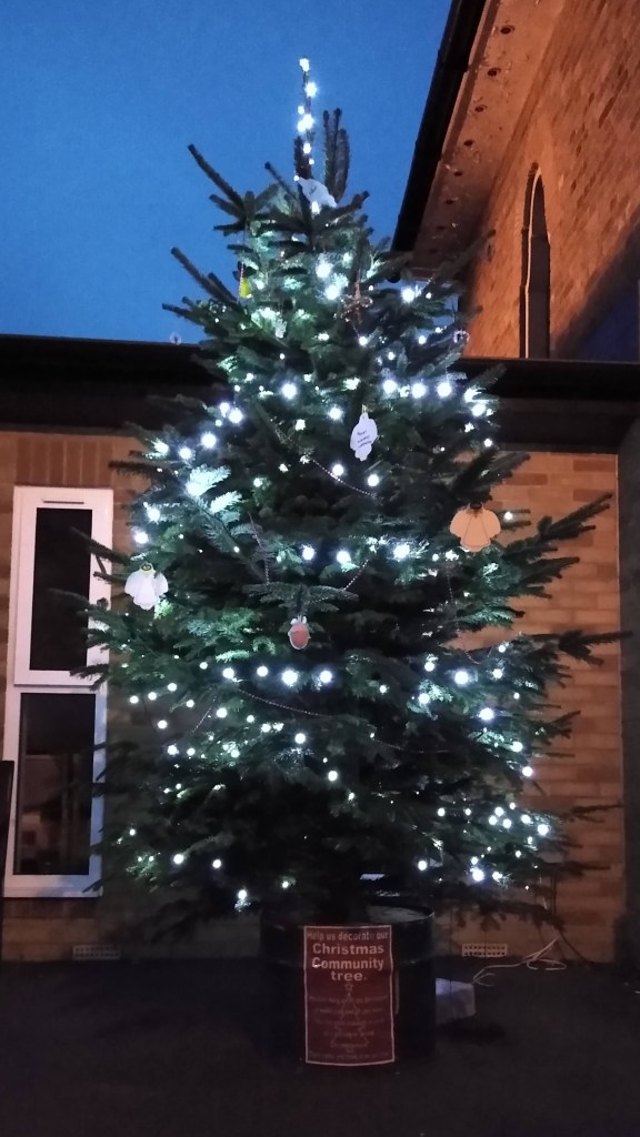Our Community Christmas Tree is ready and waiting for your decorations, prayers and wishes.