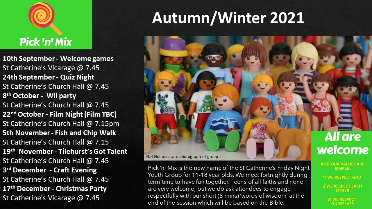 Pick and Mix – our youth group for 11-18 year olds is restarting Next Friday (10th September) with a games evening at the Vicarage.