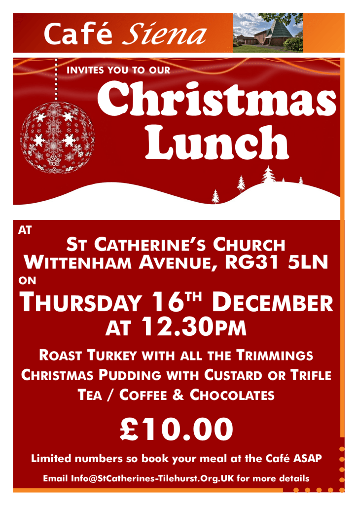 Café Siena Christmas Lunch Posted byStuart PooreDecember 10, 2021Posted inCafe, Christmas 2021, Social Share this: Click to share on Facebook (Opens in new window) Facebook Click to share on WhatsApp (Opens in new window) WhatsApp Click to share on Nextdoor (Opens in new window) Nextdoor Click to email a link to a friend (Opens in new window) Email Related