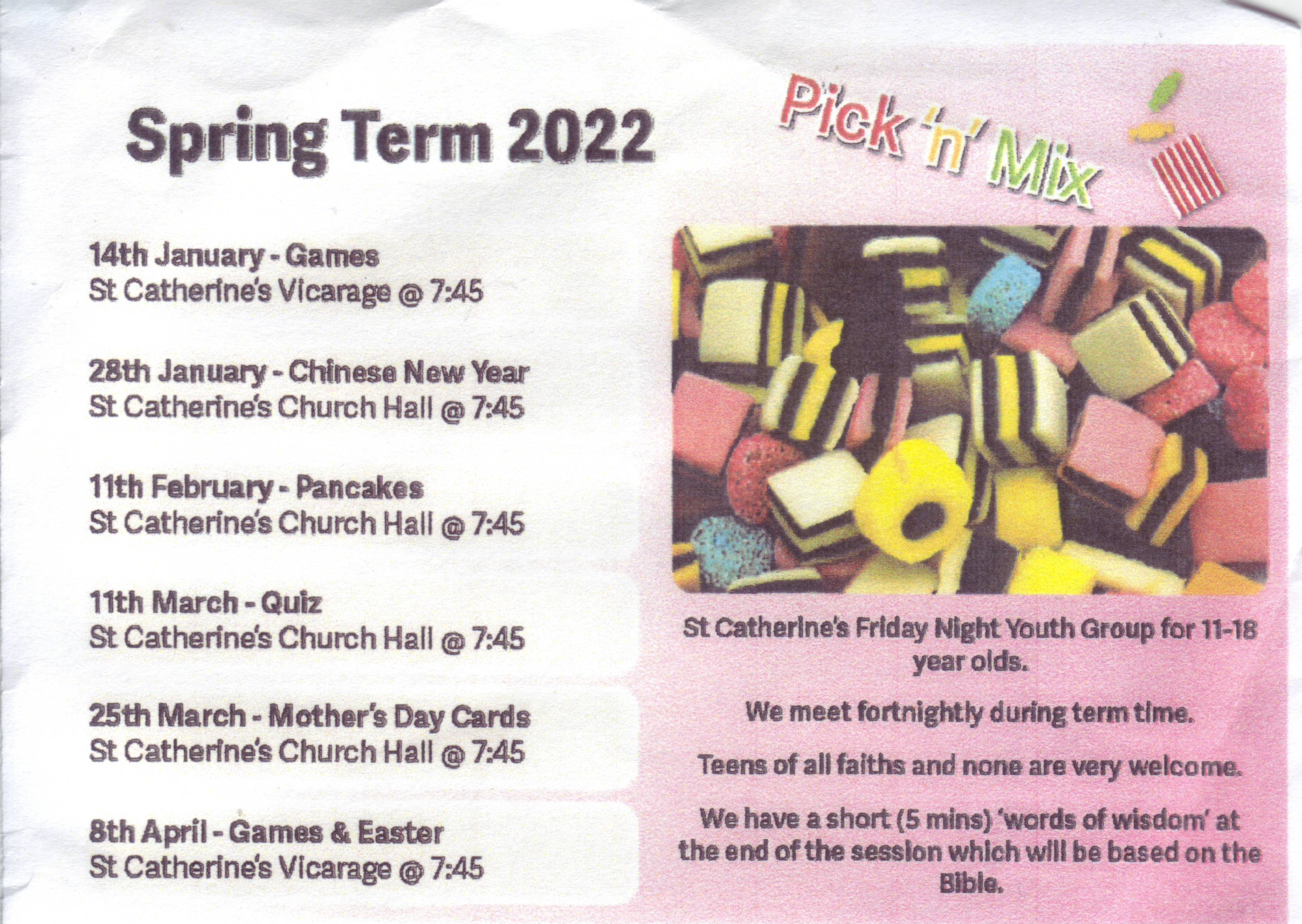 Pick and Mix – our youth group for 11-18 year olds is restarting 14th January with a games evening at the Vicarage.