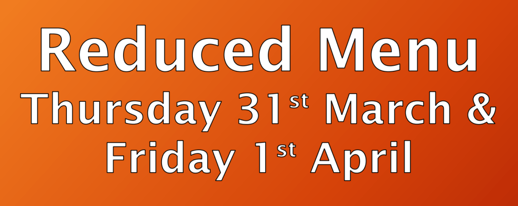 We regret that due to staff illness, we can only offer a reduced menu on Thursday 31st March and Friday 1st April. We currently expect this to be a choice of