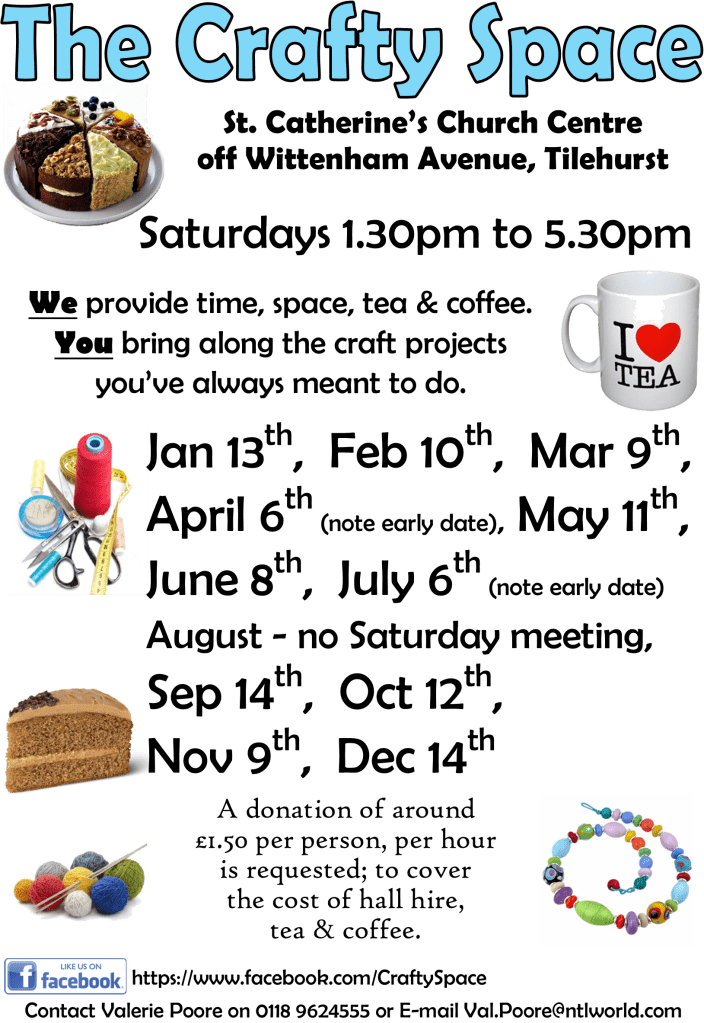 They provide space, tables, power, tea/coffee & cake. All you do is bring along those craft projects you’ve always meant to find time to do!