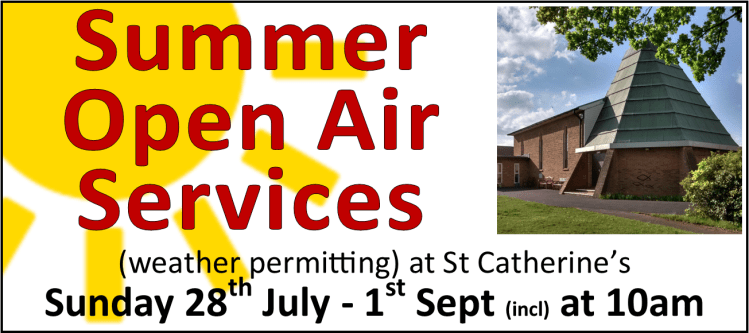 Following the success of previous years, during the Summer Holidays we will again be holding our Sunday Ten O’clock Service outdoors (weather permitting) – that is Sunday 28th July – 1st Sept inclusive. The service will include Communion on the 1st and 3rd Sundays of the month (i.e. August 4th, 18th & Sept 1st)