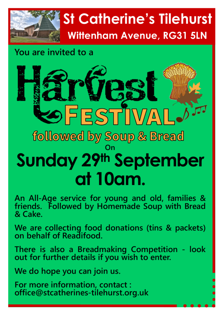 BREAD MAKING COMPETITION – you are invited to bring a home-made loaf of bread to church which will be judged by the congregation in the hall after the Harvest Festival Service.