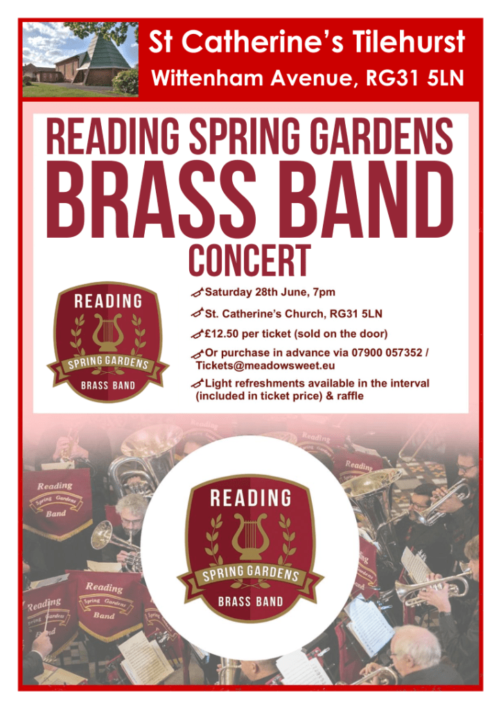 We’re delighted to present a night of music from the Reading Spring Gardens Brass Band on Saturday 28th June. starting at 7pm.