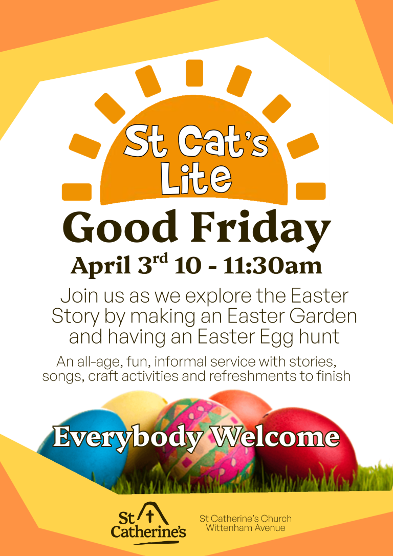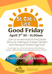 You are invited to come and celebrate at our St Cat’s Lite Good Friday All Age Service on April 3rd – 10 am to 11:30 am